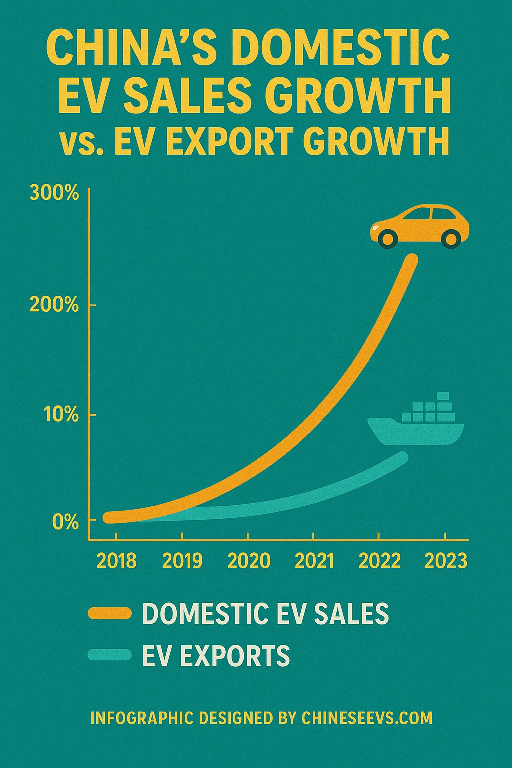 Multimedia Concept: Consider an infographic here showing a graph of China’s domestic EV sales growth vs. its EV export growth over the last 3-5 years.